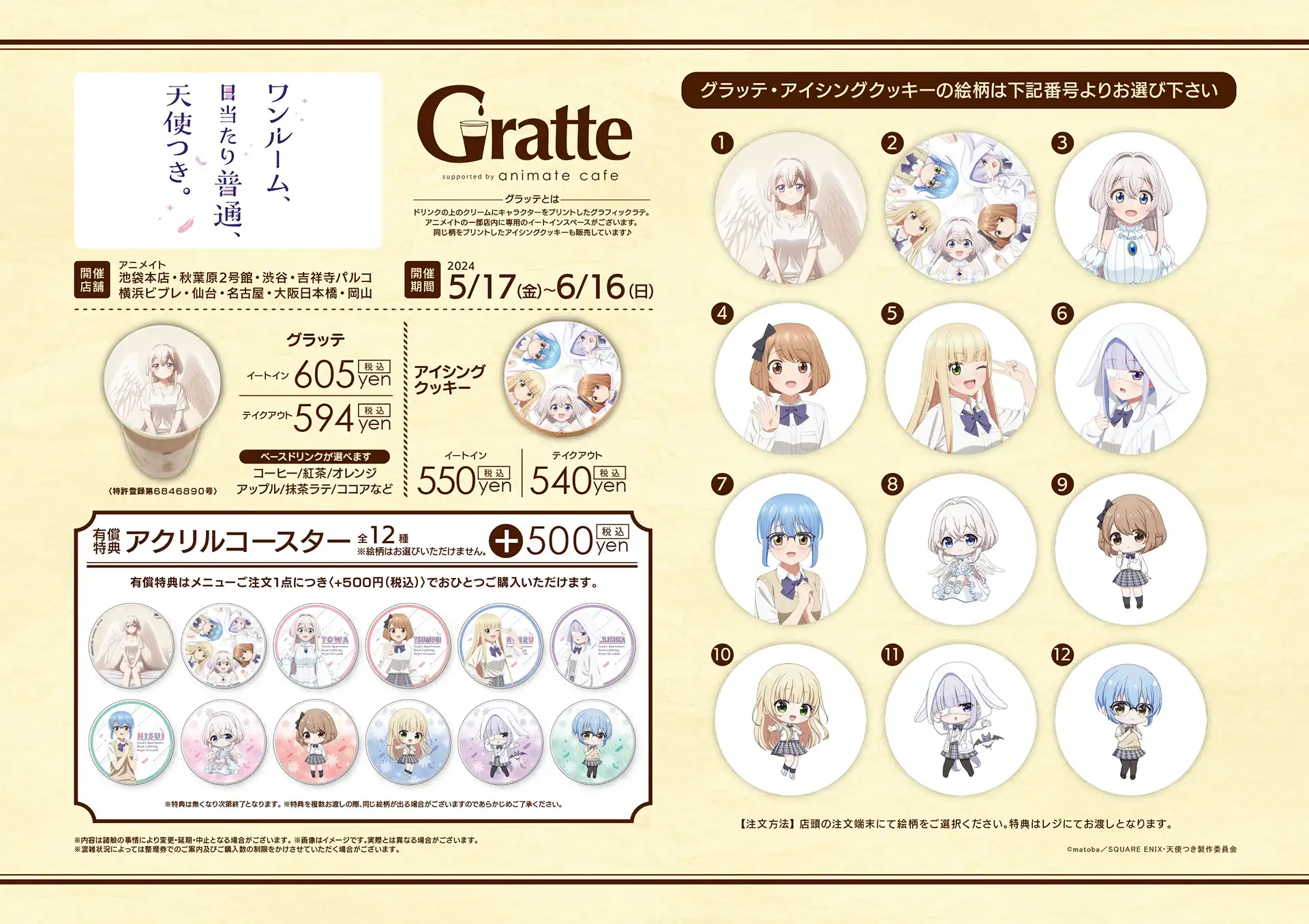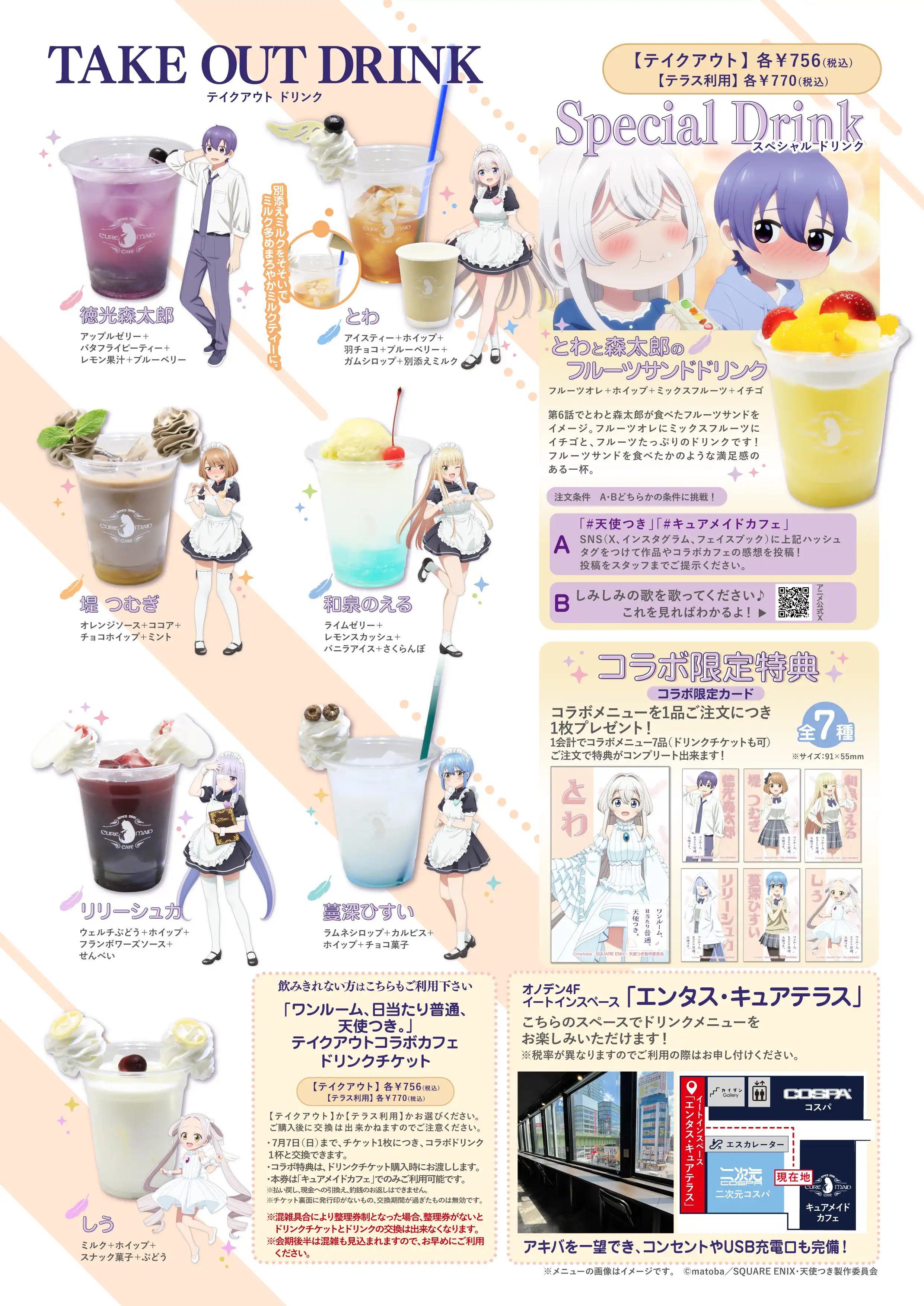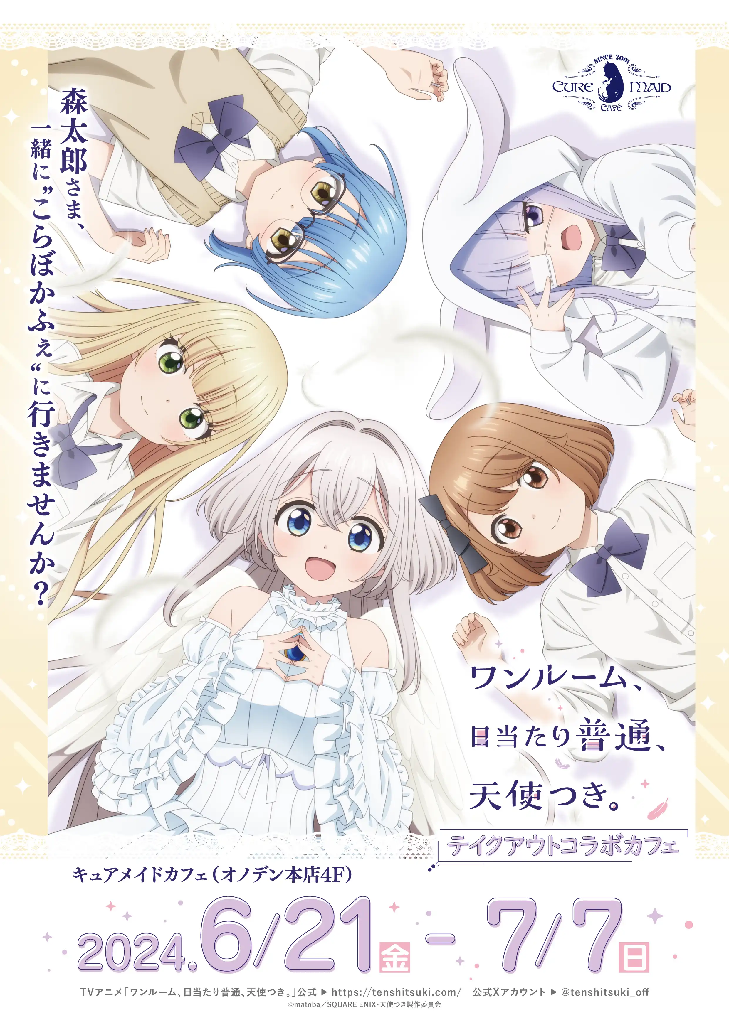 TVアニメ「ワンルーム、日当たり普通、天使つき。」のテイクアウトコラボカフェがキュアメイドカフェにて開催決定! とわやつむぎたちをイメージしたコラボドリンクをご用意。 コラボメニューご注文で限定特典もプレゼントします! メニュー詳細など、続報をお待ちください!