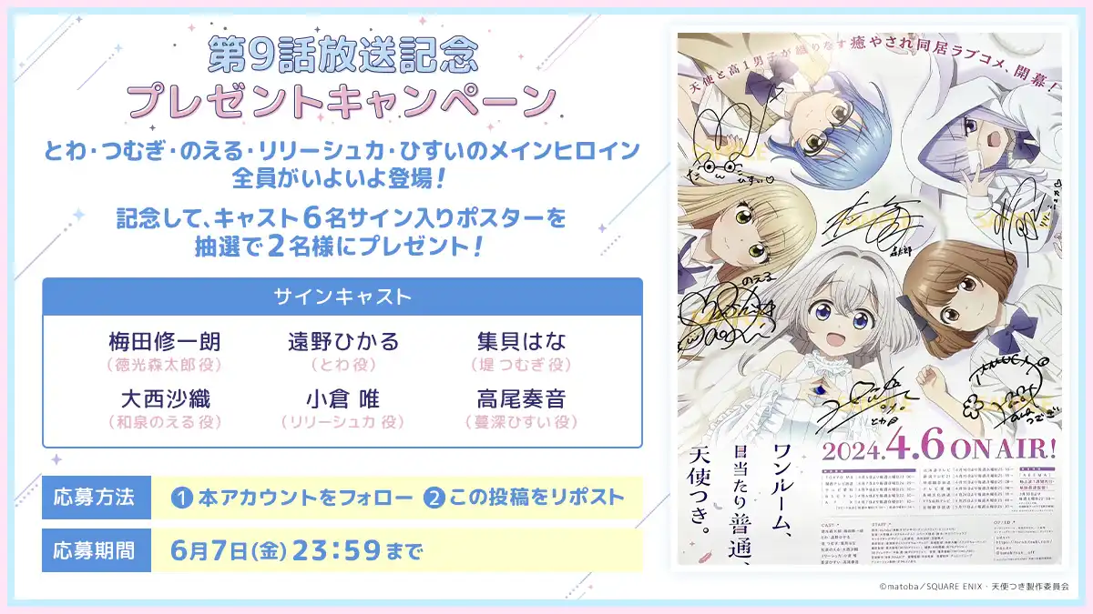 ①XにてTVアニメ「ワンルーム、日当たり普通、天使つき」公式アカウント(@tenshitsuki_off)をフォロー ②対象投稿をリポスト