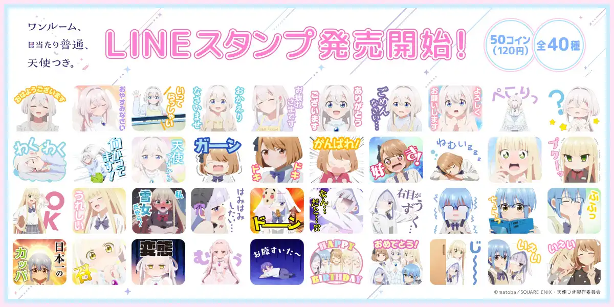 TVアニメ「ワンルーム、日当たり普通、天使つき。」のLINEスタンプが本日より発売しました! 日常使いしやすいスタンプを、全40種のラインナップでお届け! 是非トークを盛り上げてくださいね!