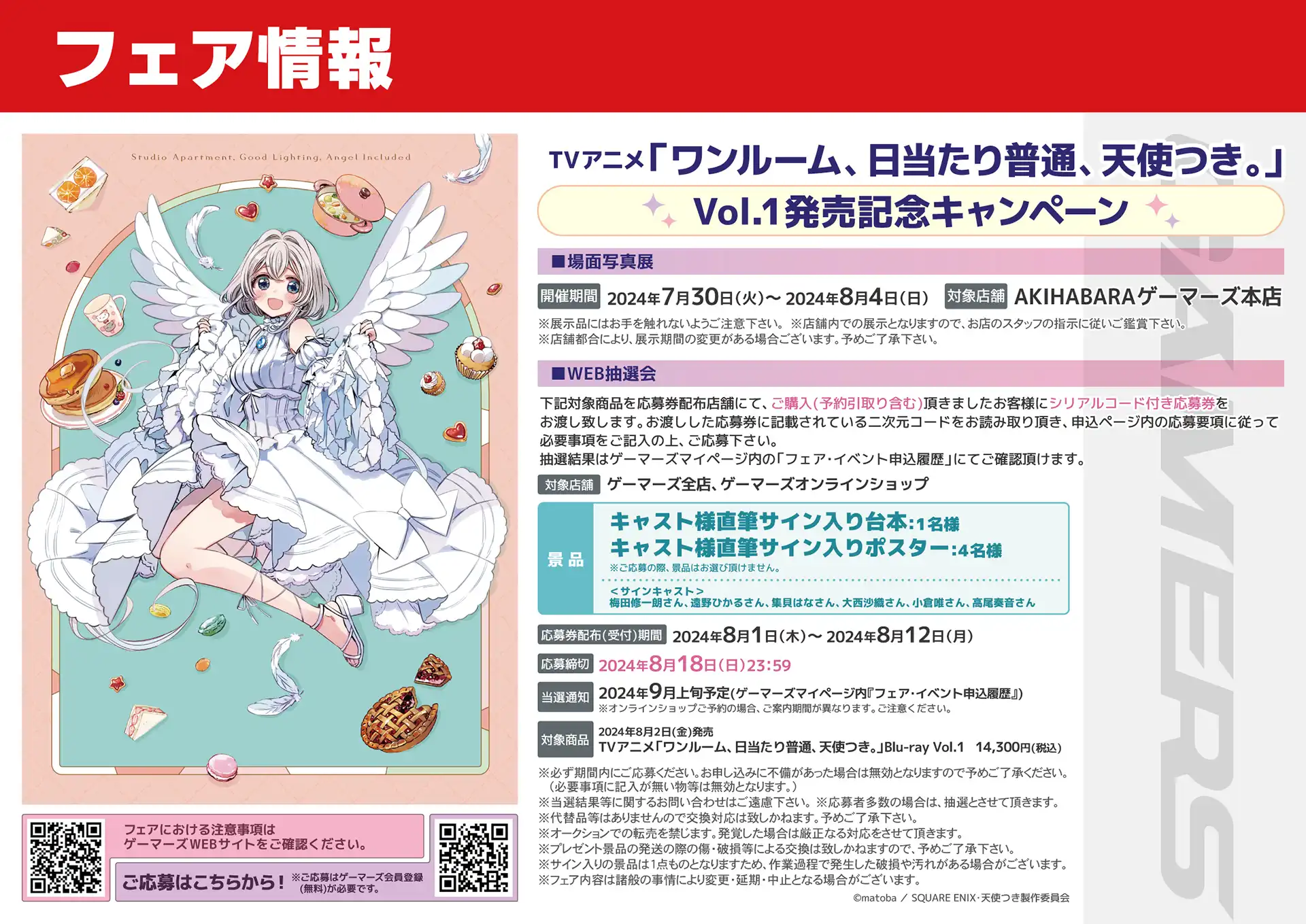 「ワンルーム、日当たり普通、天使つき。」Blu-rayの発売を記念して、AKIHABARAゲーマーズ本店にて場面写真展の開催が決定! さらに、ゲーマーズ全店にてメインキャストのサイン入りポスターや台本が当たるWEB抽選会も開催! ぜひ足を運んでみてください!